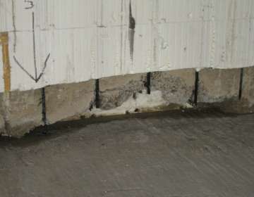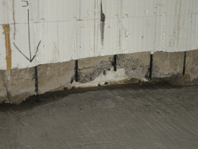 - Concrete that is pitted or has voids within the wall. These often occur during construction, but the effects of poor workmanship won’t show up until much later. One such example is seen in low quality concrete pours in ICF foundation construction. This style of foundation may offer home owners a higher insulation rating, but it never reveals the quality of the concrete pour for inspection purposes. The attached insulation on both sides of the concrete always conceals any flaws that may exist in the concrete, and contrary to popular perception, the foam insulation is not a waterproofing product. This style of foam-insulated concrete wall also rejects many of the “non-destructive” leaky basement investigative methods, such as thermal imaging. The only way to properly inspect the affected wall is through removing everything that is concealing the actual concrete. Removing the Styrofoam form insulation from concrete wall is a very laborious task.