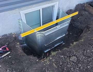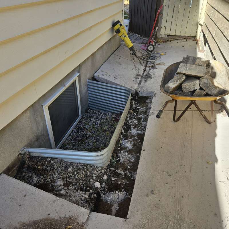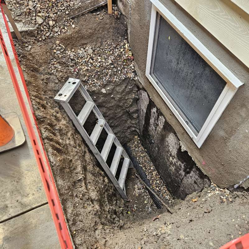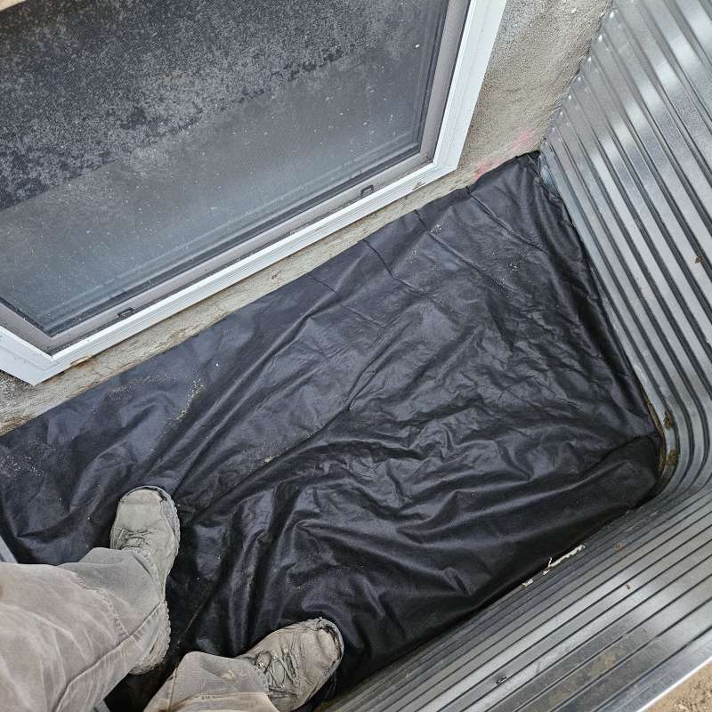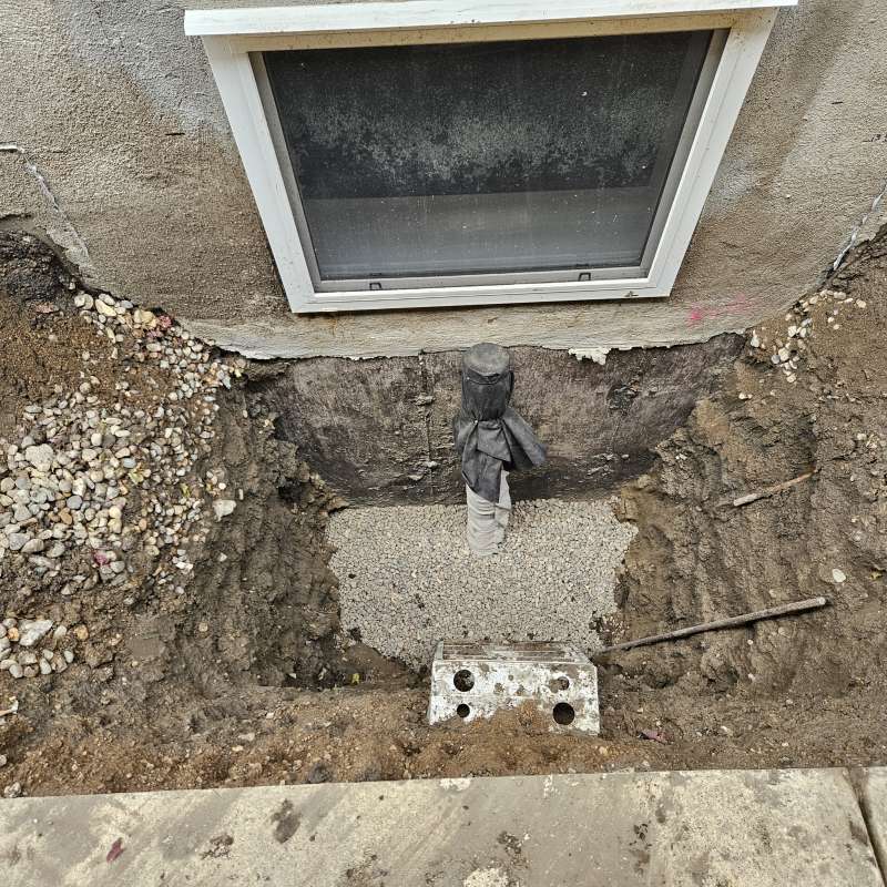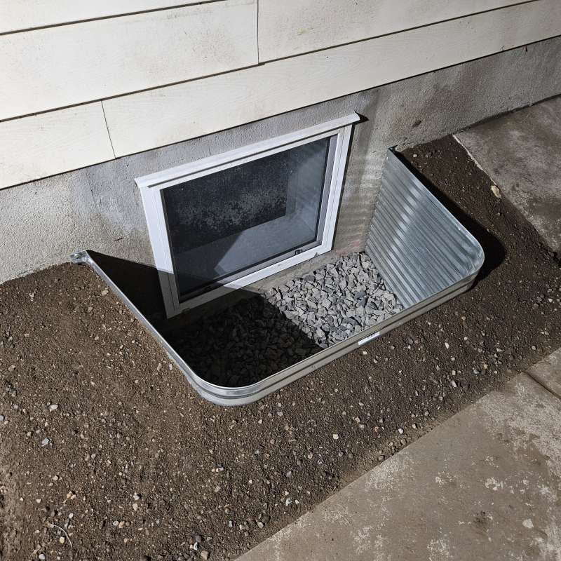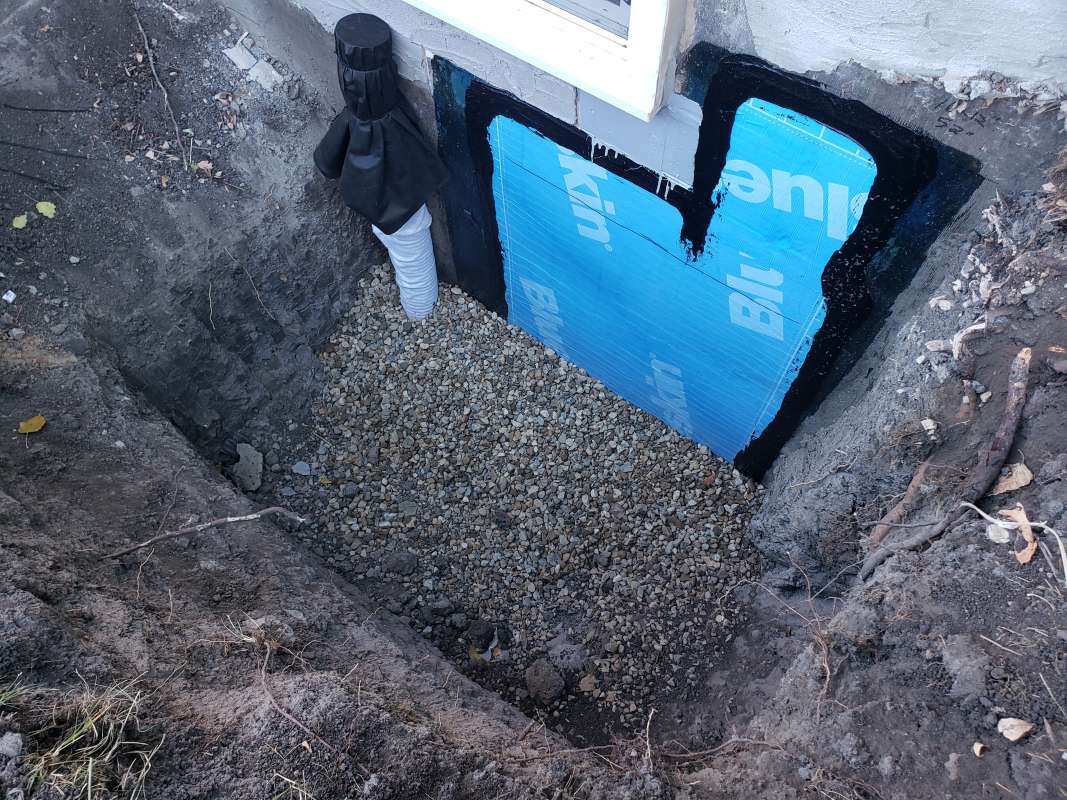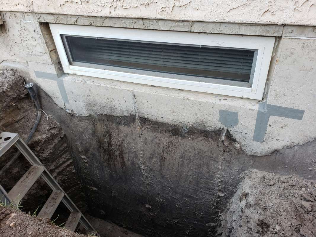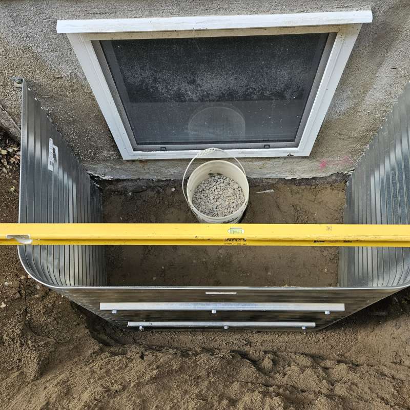 A proper weeping-tile system, located at the footing of the foundation, is a pre-requisite for this type of repair or upgrade. The window area is excavated down to the existing weeping-tile. A vertical section of weeping-tile is “T”-ed into the main weeping-tile below. The new vertical drain stack is securely anchored to the wall to prevent movement, a drain cover and geotextile wrap is installed, and the excavated area is backfilled. The new window-well will be installed and secured to the foundation around the window, and decorative landscape rock is placed inside the window-well, concealing the top of the new drain cover. A detailed photo USB drive of the repair work is supplied to all customers.
