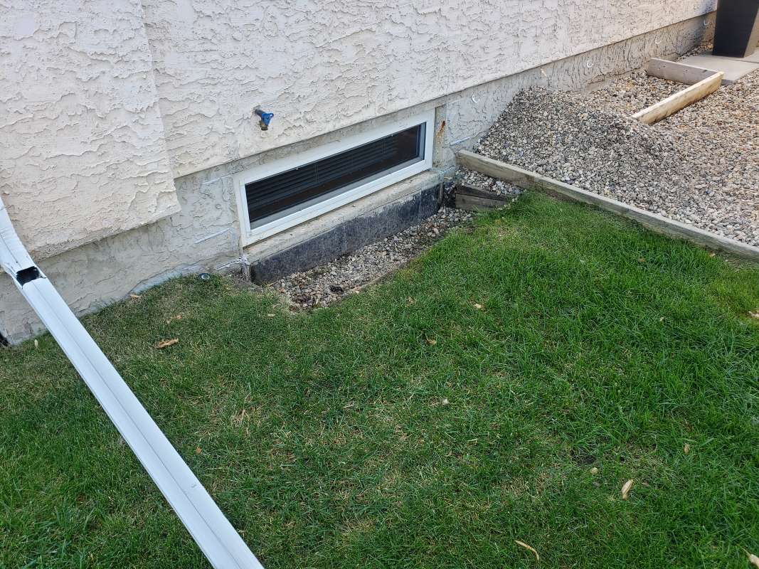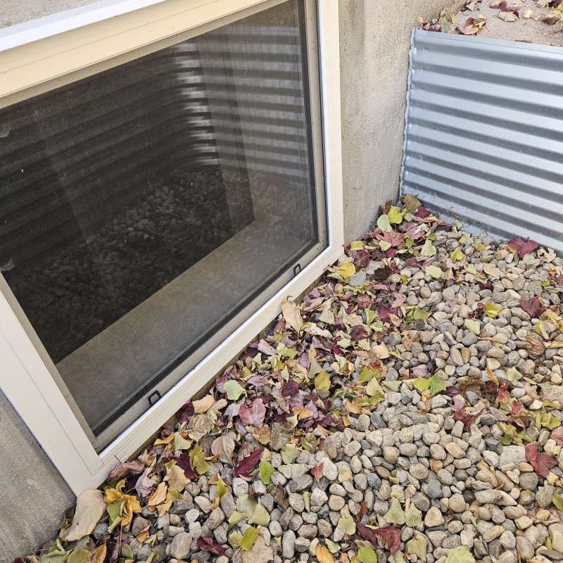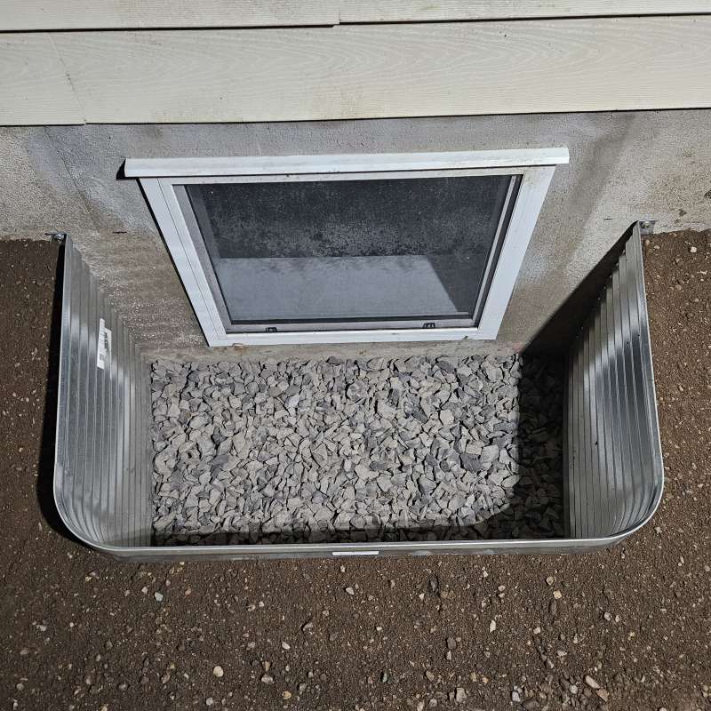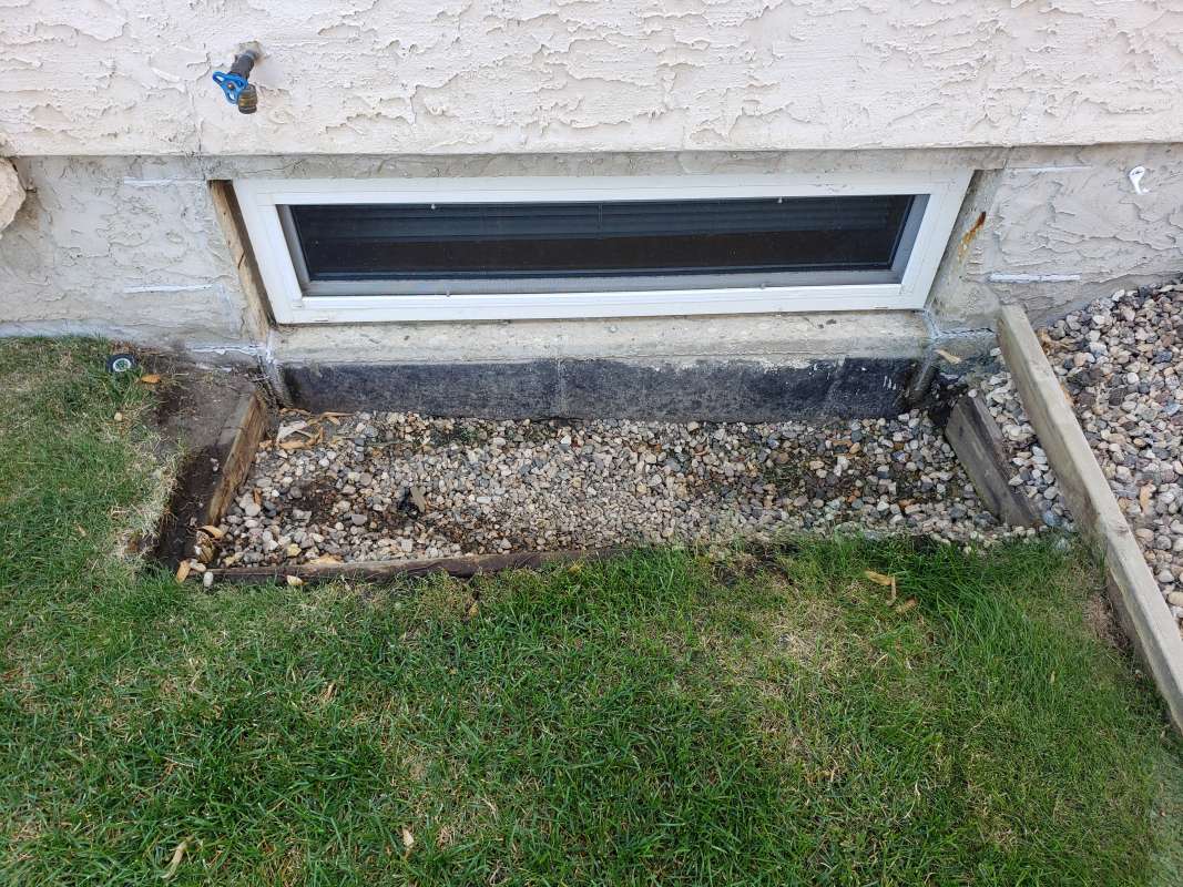 One of two problems occurred, First, the vertical drain stack was not mounted to the foundation and simply moved during the backfill process. It no longer was in place to drain over the foundation weeping-tile. Secondly, the practice of filling the vertical window-well drain stack with crushed rock was thought to serve two purposes: it prevented the vertical drain stack from collapsing (crushing) during the backfill process, and it slowed the infiltration of dirt and sediment into the system. This construction logic has failed in our cold Canadian prairie climate. Aside from the sediment slowly making its way into the pours of the crushed rock and solidifying, the spring snow melt adds further complications. The melting snow would travel through the rock in the vertical drainage pipe, then freeze due to the cold ground temperature. The porous rock simply turned into a solid mass and window-wells started accumulating surface water. The windows themselves would fail to drain properly and then start to leak water into the basement living space.