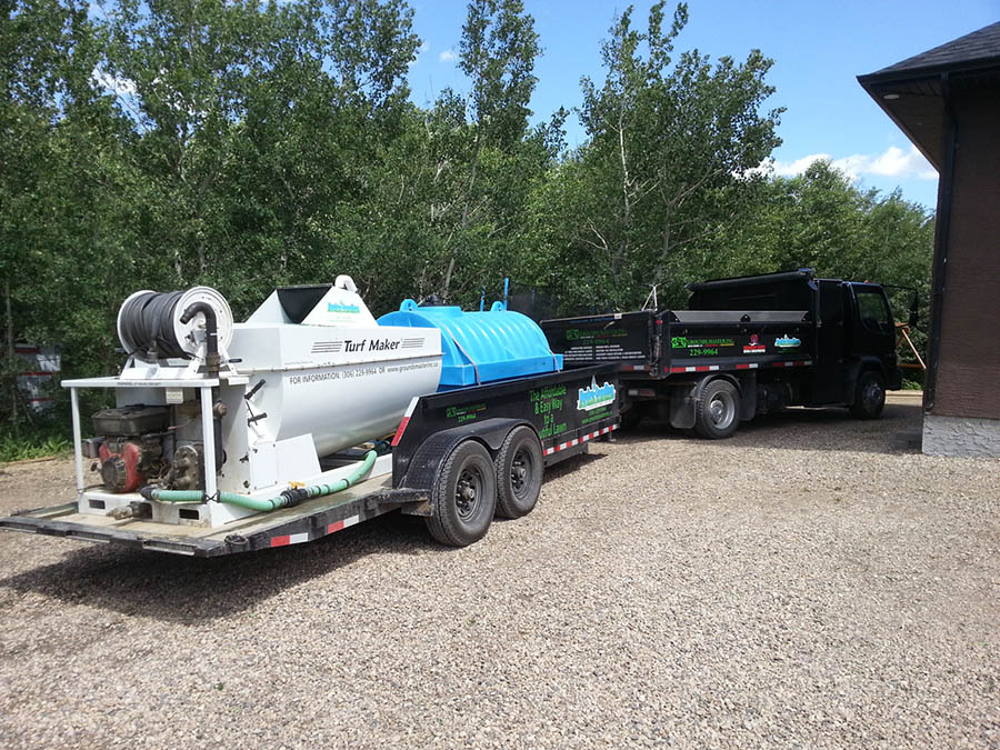 Grounds Master Inc. provides hydroseeding services to all sizes of projects, from residential lots and acreages, to large construction and reclamation projects. Hydroseeding also provides excellent erosion control. You can choose the best choice for coverage, including drought-tolerant grass seed, wildflowers, or any other crop that will stabilize a hillside. Additionally, a stronger layer of hydromulch, such as a Bonded Fiber Matrix blanket (BFM) or a Flexible Growth Medium (FGM), along with a special tacking agent to bond the seed to the soil, can be applied. Along with the included starter fertilizer(s), this version of an erosion control blanket will withstand harsh weather conditions, thus allowing the seed to remain stable so that it can germinate and grow without being easily washed or blown away.